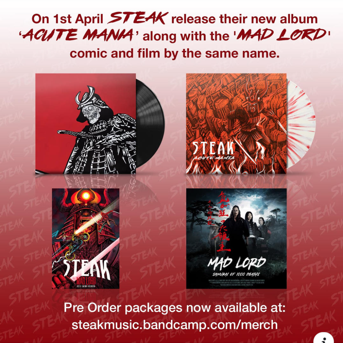 The ‘Mad Lord’ project is a creative collaboration between STEAK and filmmaker Samuel Smith, who have produced an interconnected body of work that coincides with the release of the album. With the vinyl edition of ‘Acute Mania’ will come a 24-page comic book entitled ‘Steak: Mad Lord’. Written by Samuel Smith and illustrated by Rhys Wooton, it brings together STEAK‘s long-established post-apocalyptic future and the Samurai world of feudal Japan taken from the short film ‘Mad Lord: Samurai of 1000 Deaths’, which will also be released on April 1st worldwide.