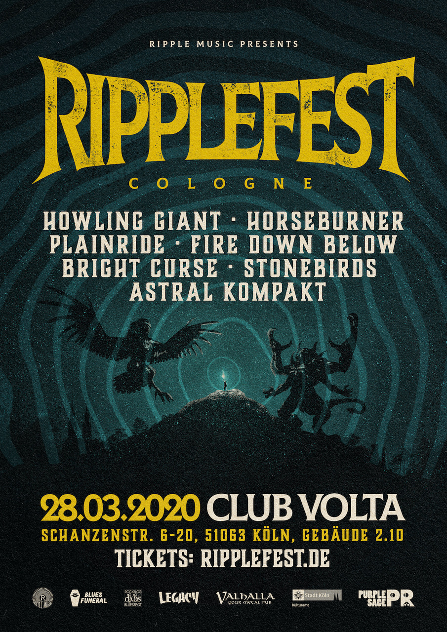 RIPPLEFEST returns. No need to wait till summer to dive back into the festival season. After an outstanding debut in 2019, RIPPLEFEST COLOGNE returns to Club Volta on March 28th. Spearheaded by California-based heavy rock label RIPPLE MUSIC, the festival presents seven bands from five countries, covering all that is heavy, from knuckle-dragging stoner doom to easy-breezing heavy psych. There will be an art corner with artists presenting their work, both locals and from afar, as well as a food truck for hungry rockers to refuel their stomachs before jumping back into the fray.